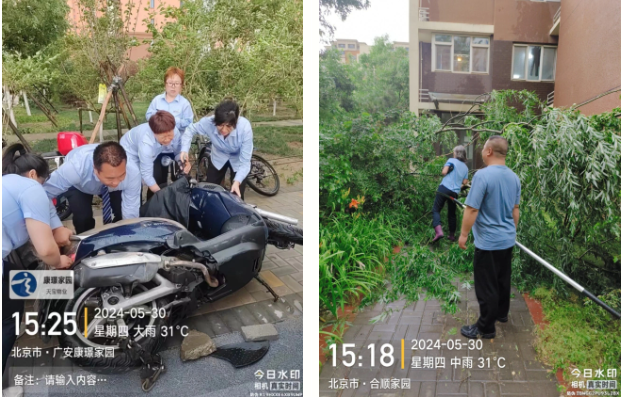 強降雨大風來臨后,天寶物業公司又積極組織各項目部職工頂風冒雨加大公區、中控機房的巡視力度和頻次,對突發的樹木倒塌、低洼點位積水等情況派專人查看并在現場值守,提醒居民注意安全,同時立即協調配合電力、園林、市政等有關部門對倒塌的樹木、低洼點位積水進行清理,確保居民生命財產安全。